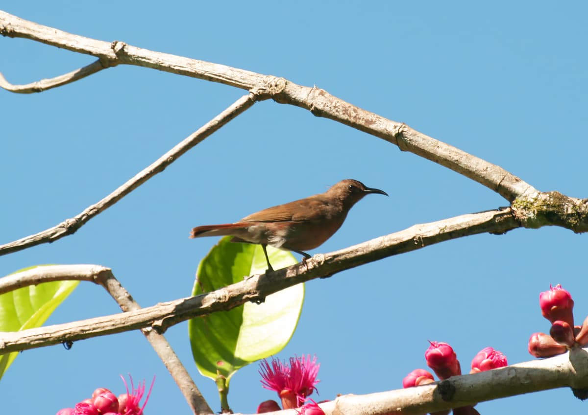 I encountered Biak Myzomela on a number of occasions but only photographed it once. Back then the species was still lumped with the Dusky Myzomela in some bird lists. The bird I photographed was next to one of the roads that crosses Biak’s interior feeding on the flowers of a Malayan Apple tree Syzygium malaccense alongside a few parrot species such as Red-cheeked parrots and Biak Lorikeets. To be frank, I was more focused on the parrots. The main reason I decided to photograph the myzomela was to document some of the birds that were feeding in the same tree as the parrots!